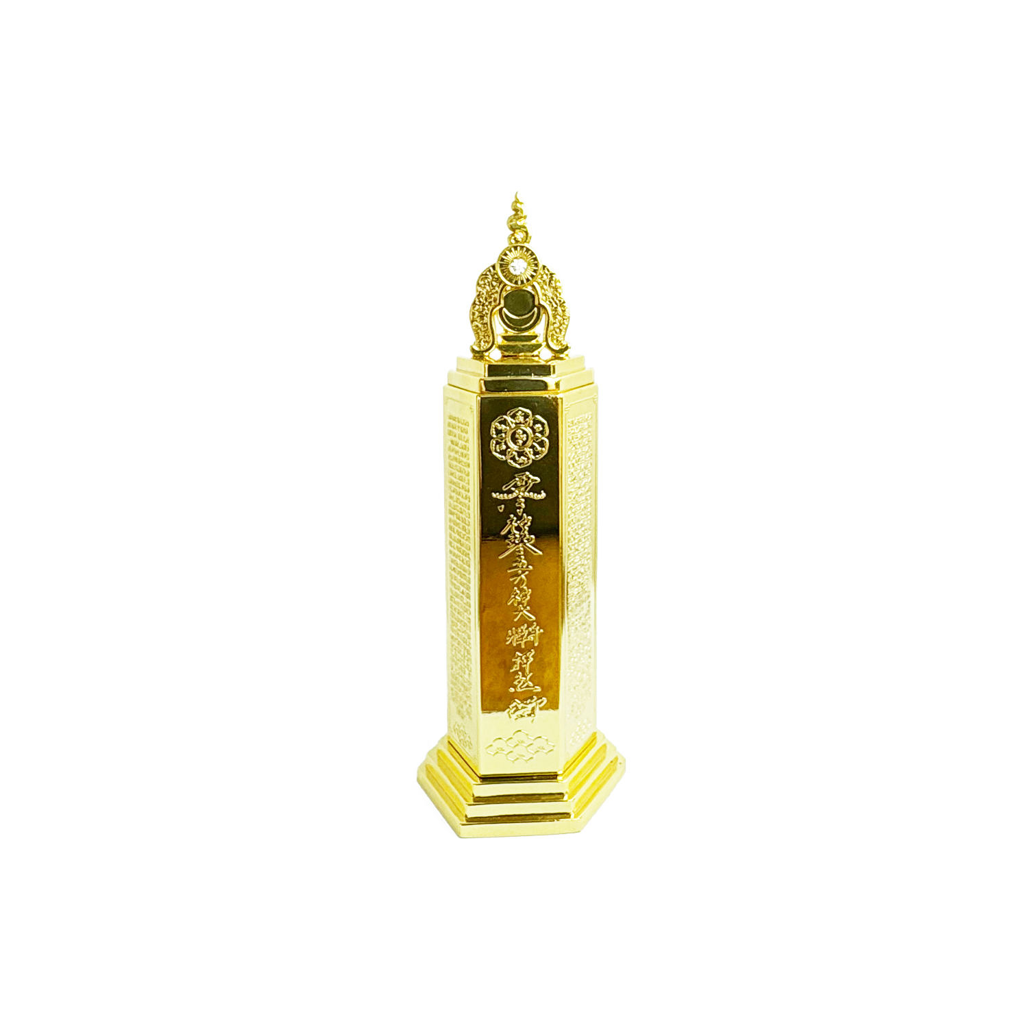 Shaped as a six-sided pillar, the pagoda is engraved with the Five Yellow Talisman, the Heart Sutra mantra on each column, and the sacred Om Mani Padme Hum symbol — all working in unison to dispel obstacles, dissolve negative karma, and protect against loss, illness and misfortune.